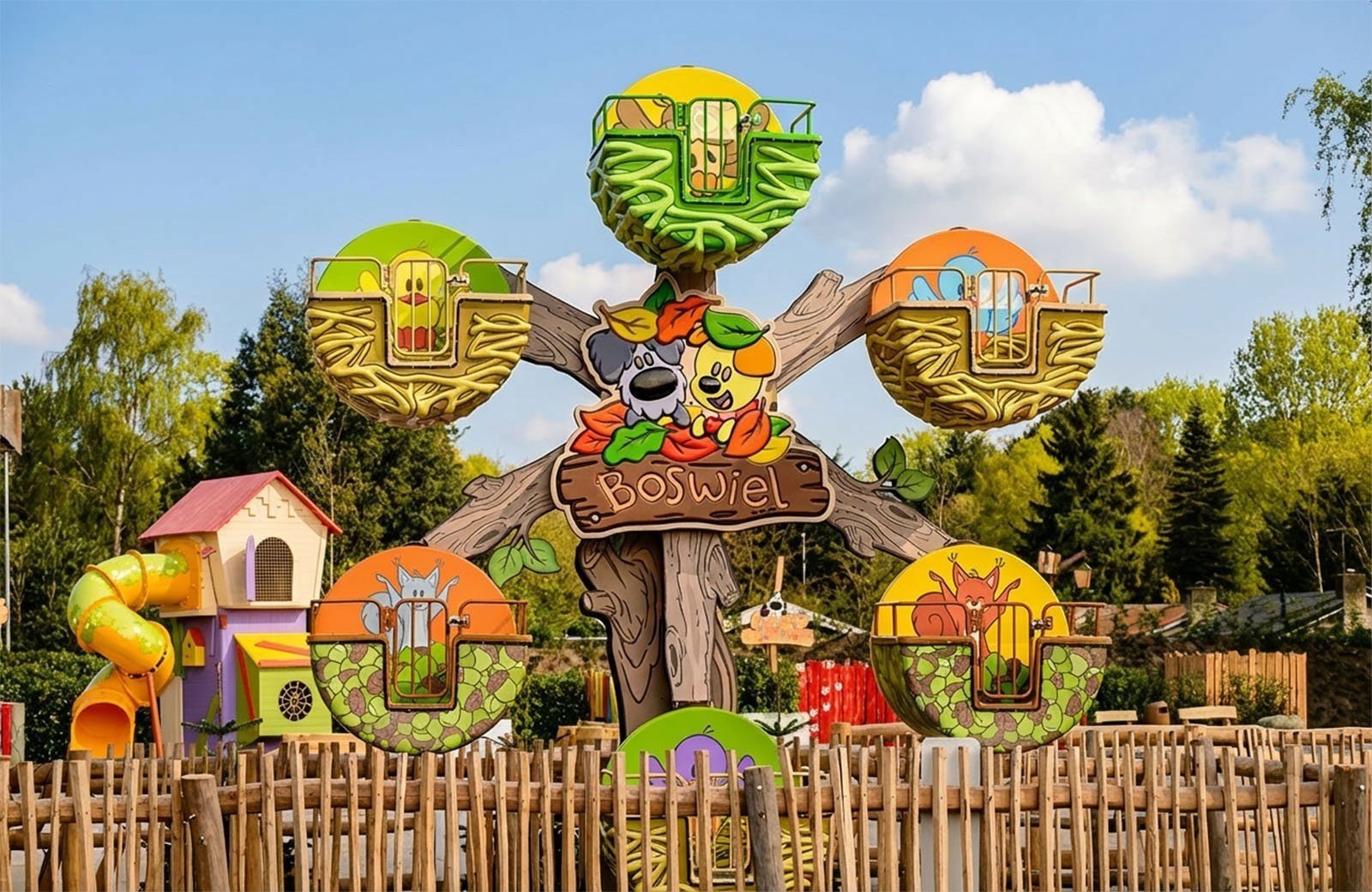 Het Boswiel in het Avonturenpark van Woezel & Pip is een reuzenrad met de vrolijkste bosdiertjes! In deze lieve attractie maak je een rustig ritje in een van de vogelnestjes, hoog tussen de bomen waar uiltjes, vogeltjes en eekhoorns wonen. Elk nestje is omringd door kleurrijke bosdieren die je onderweg begroeten. Het Boswiel is speciaal ontworpen voor jonge kinderen en hun ouders: en de perfecte plek om even tot rust te komen terwijl je tóch hoog de lucht in gaat.