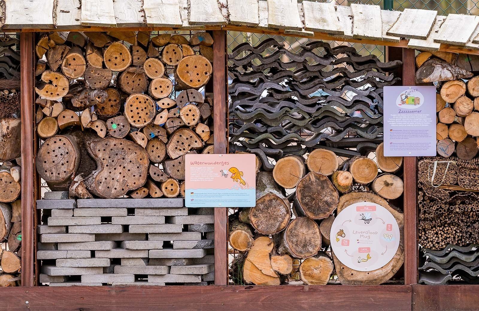 Voel je het al kriebelen? De insectenwand in het Bibliobos is een echte thuis voor de kleine beestjes van de Tovertuin. Wijze Varen koos oud hout, ruwe takken en stenen met zorg uit. Want niet elk kriebelbeestje woont hetzelfde. Mestkevers houden van dode takken. Mieren bouwen liever diep in de grond. Spinnen zoeken een rustige plek in een kier. Brrr! De insectenwand biedt al die beestjes precies wat ze nodig hebben.