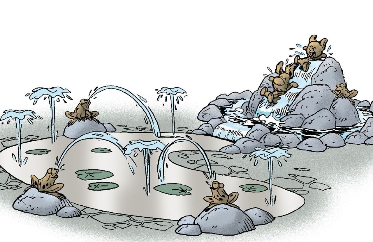 De Toverbron is een waterspeelplek waar kinderen lekker vrij kunnen spetteren en kliederen. Tussen fonteintjes, gootjes en sproeiers ontstaan de leukste waterspelletjes. Woezel en Pip doen niets liever dan vrij spelen met water! Vergeet je droge kleren niet!