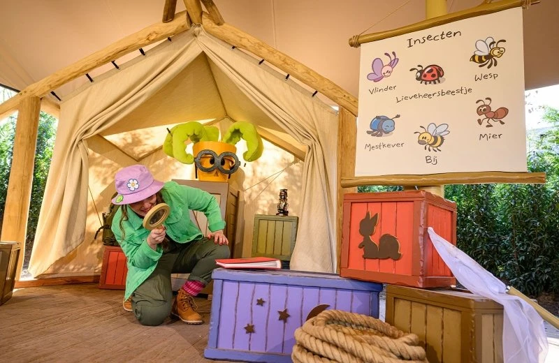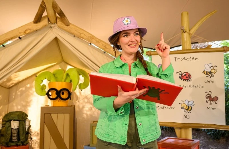 Midden in het Bibliobos, tussen de bomen en in de frisse buitenlucht, vind je dit bijzondere openluchttheater. In de show van dit seizoen heeft Wijze Varen hier zijn onderzoekskamp opgeslagen voor een expeditie. Hij heeft een hoop kisten vol boeken met belangrijke weetjes over de natuur meegenomen en vertelt zijn gasten daar graag over.
